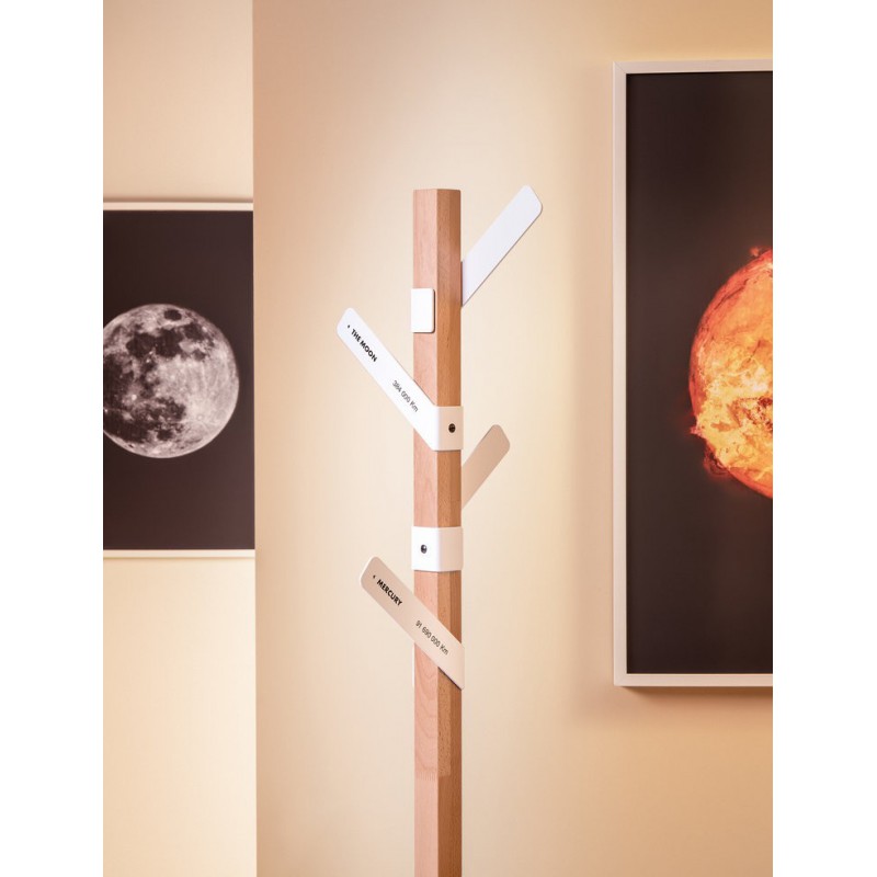 Perchero de pie en madera con 4 perchas metálicas apuntando a 4 sitios diferentes: La Luna, el Sol, Júpiter y Mercurio son los destinos preferidos del modelo estándar, pero puedes personalizarlos con lo que quieras. Es ideal en ambientes confort.