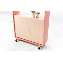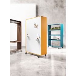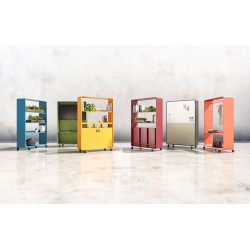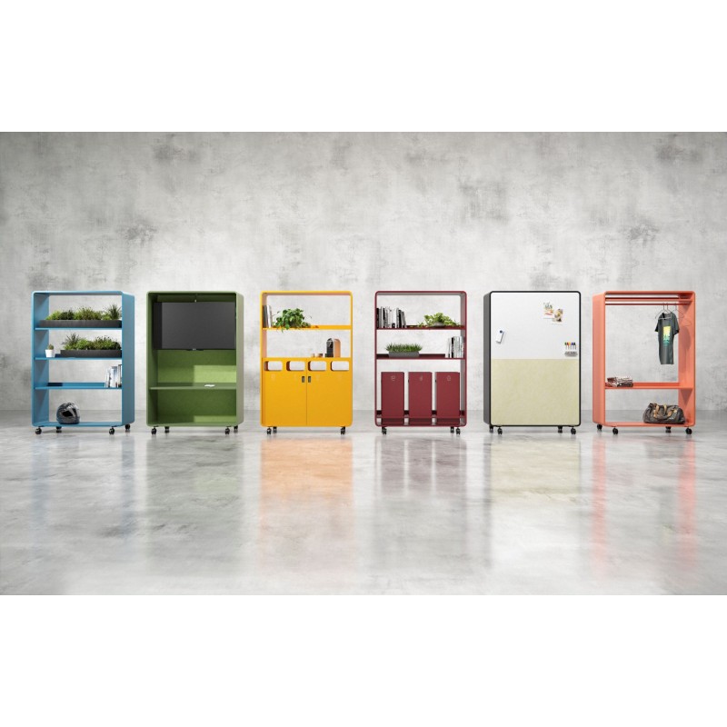 GO es un un mueble metálico multifuncional móvil para oficinas y espacios de reuniones. Armarios, estanterías, papeleras de reciclaje, percheros, paneles acústicos y pizarras son combinables con su extensa gama de accesorios. Además disponible en 16 colores de nuestra carta RAL. Sistema configurable dotado de ruedas con freno.