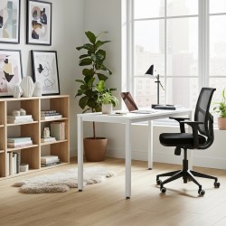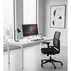Aporta un diseño minimalista en la oficina. Estructura perimetral de acero, pintada epoxi gris o blanco. Sus patas son ligeras (40x40 mm) y resistentes. Con niveladores de altura.