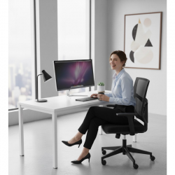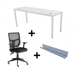 Diseñada para trabajar mejor y sentirse mejor: mesa con 2 pasacables y bandeja de cableado horizontal, acompañada de una silla ergonómica, cómoda y económica.