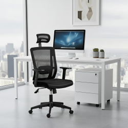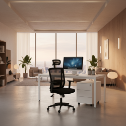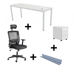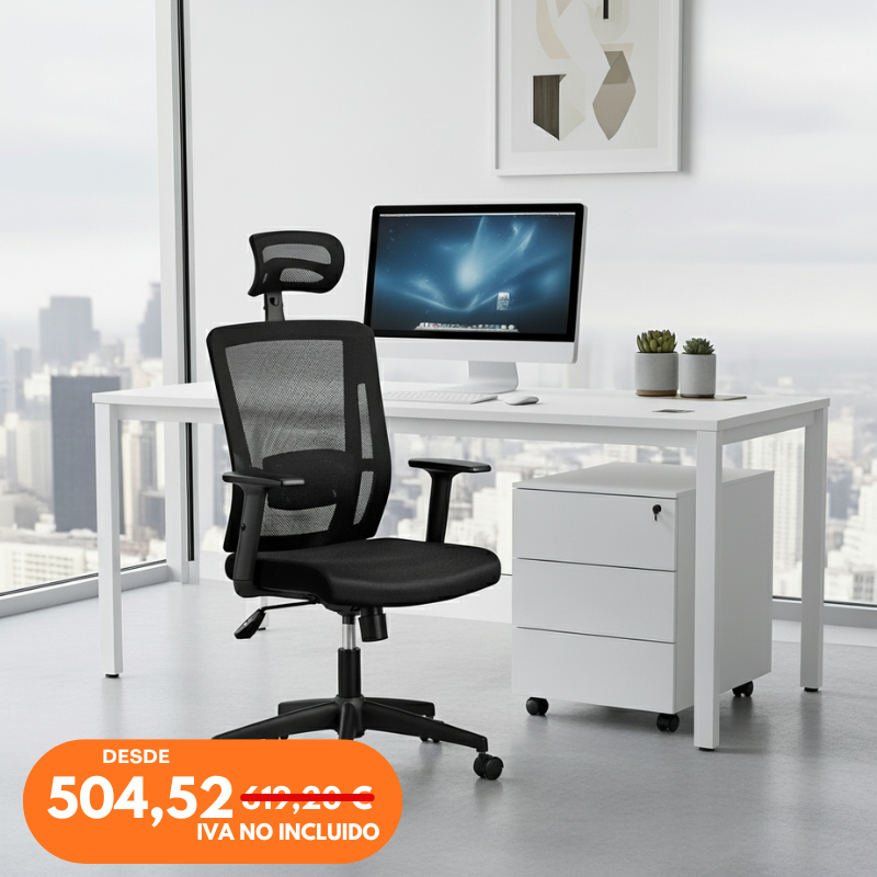Diseñada para trabajar mejor y sentirse mejor: mesa con 2 pasacables y bandeja de cableado horizontal, acompañada de una silla ergonómica y una cajonera con ruedas.