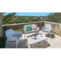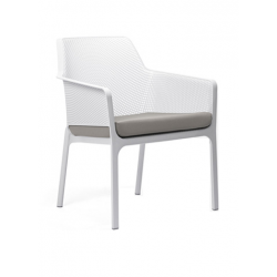 Romántico y empático, es un sillón para exteriores de resina de fibra de vidrio. Caracterizado por un motivo de agujeros cuadrados y rayados, presenta líneas pulidas, perfiles finos sin solución de continuidad y una amplia gama de cojines para combinar.