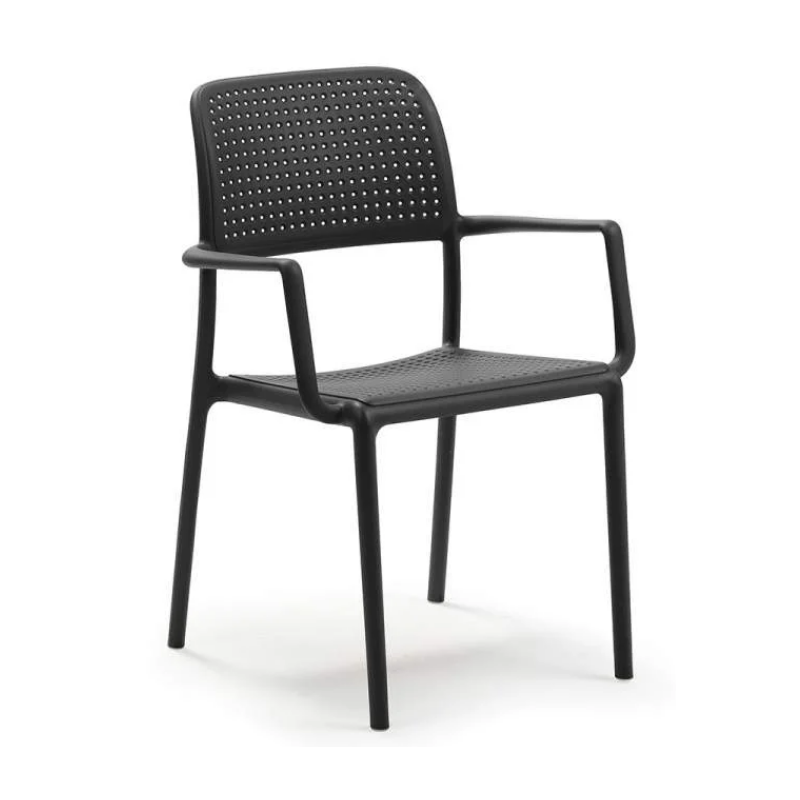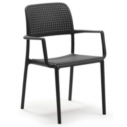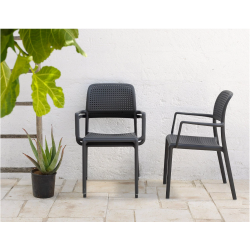 Ligera y fresca, Bora es una cómoda silla de resina de fibra de vidrio con brazos, estructura tubular sin interrupciones y perfiles redondeados. Asiento y respaldo forman un solo elemento que hacer destacar formas estéticas que recuerdan suaves acolchados textiles.