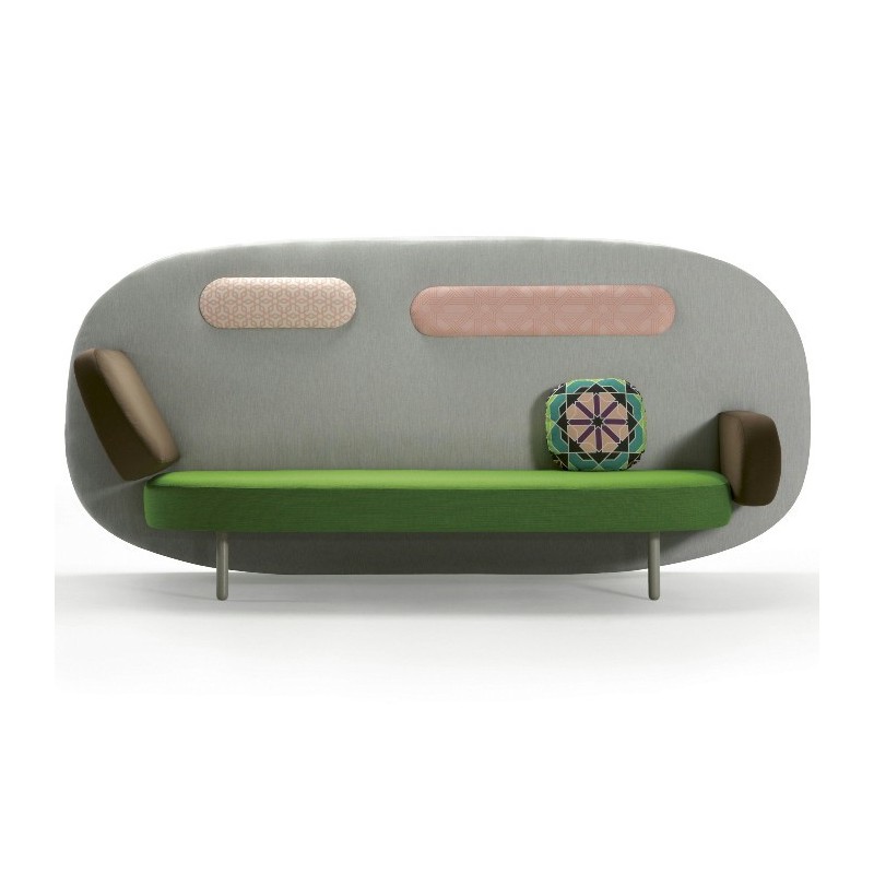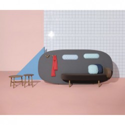 Un sofá que hace las veces de biombo. Diván contemporáneo pensado para múltiples usos. Este delgado asiento flotante, con pared incorporada, nos concede total privacidad en entornos abiertos para recostarnos, colgar la bufanda y el abrigo, o simplemente esperar en el reservado que dispone su enorme respaldo.