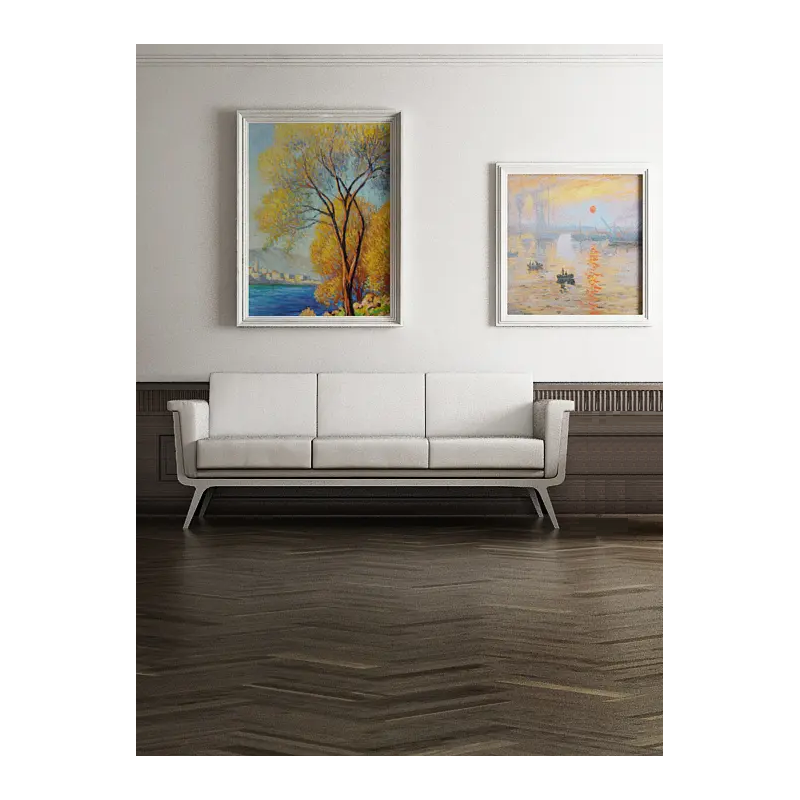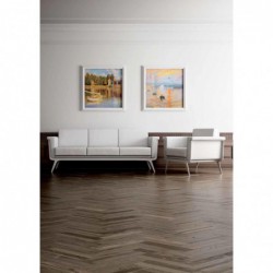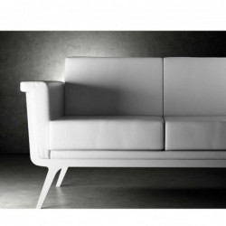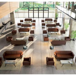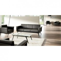 Este sofá mantiene brazos y cojines tapizados sobre espuma de poliuretano indeformable de alta resistencia. Existe la posibilidad de incorporar mesas de centro en madera o en cristal. Estructura metálica sobre la que se apoya la base y el respaldo de madera completamente tapizado.